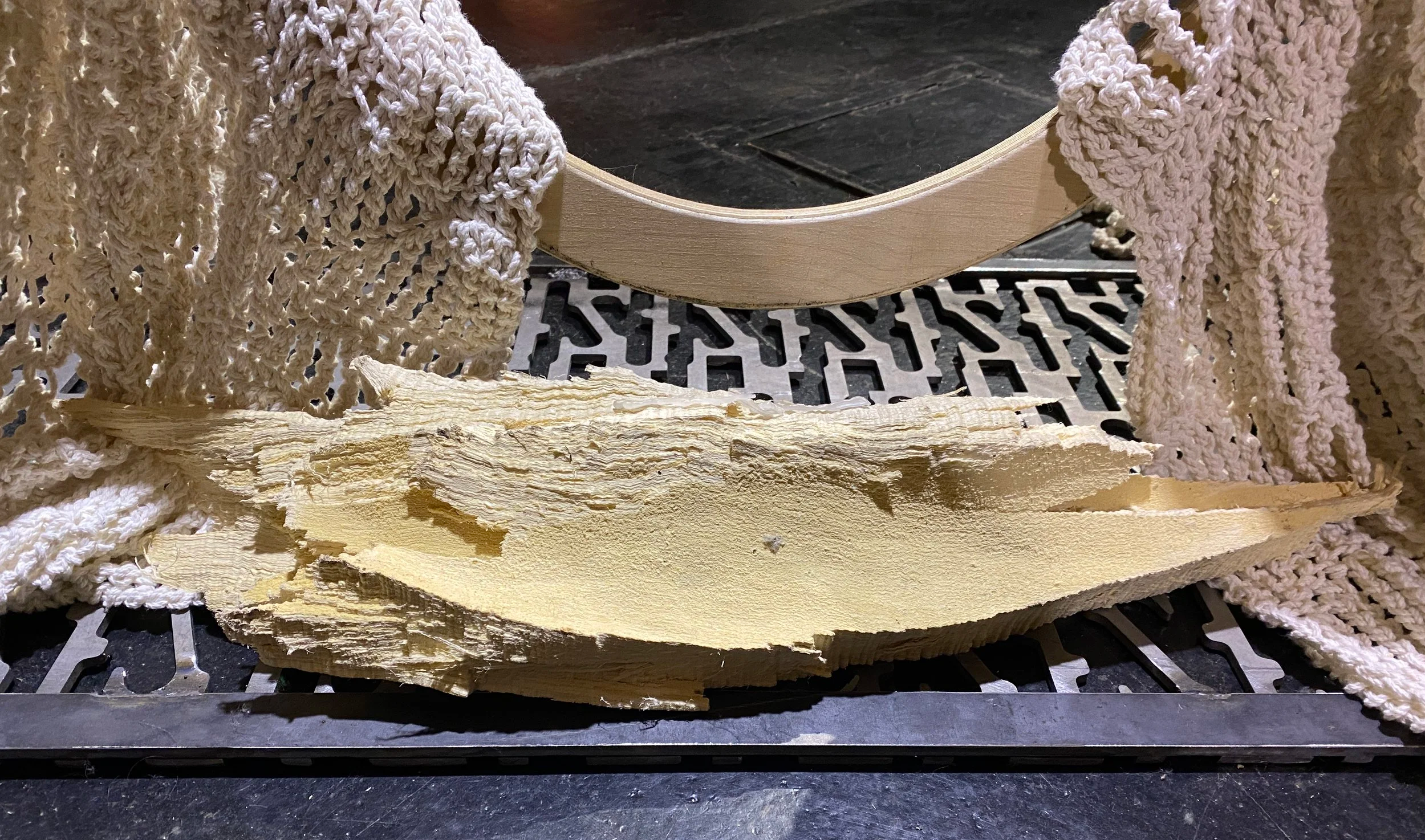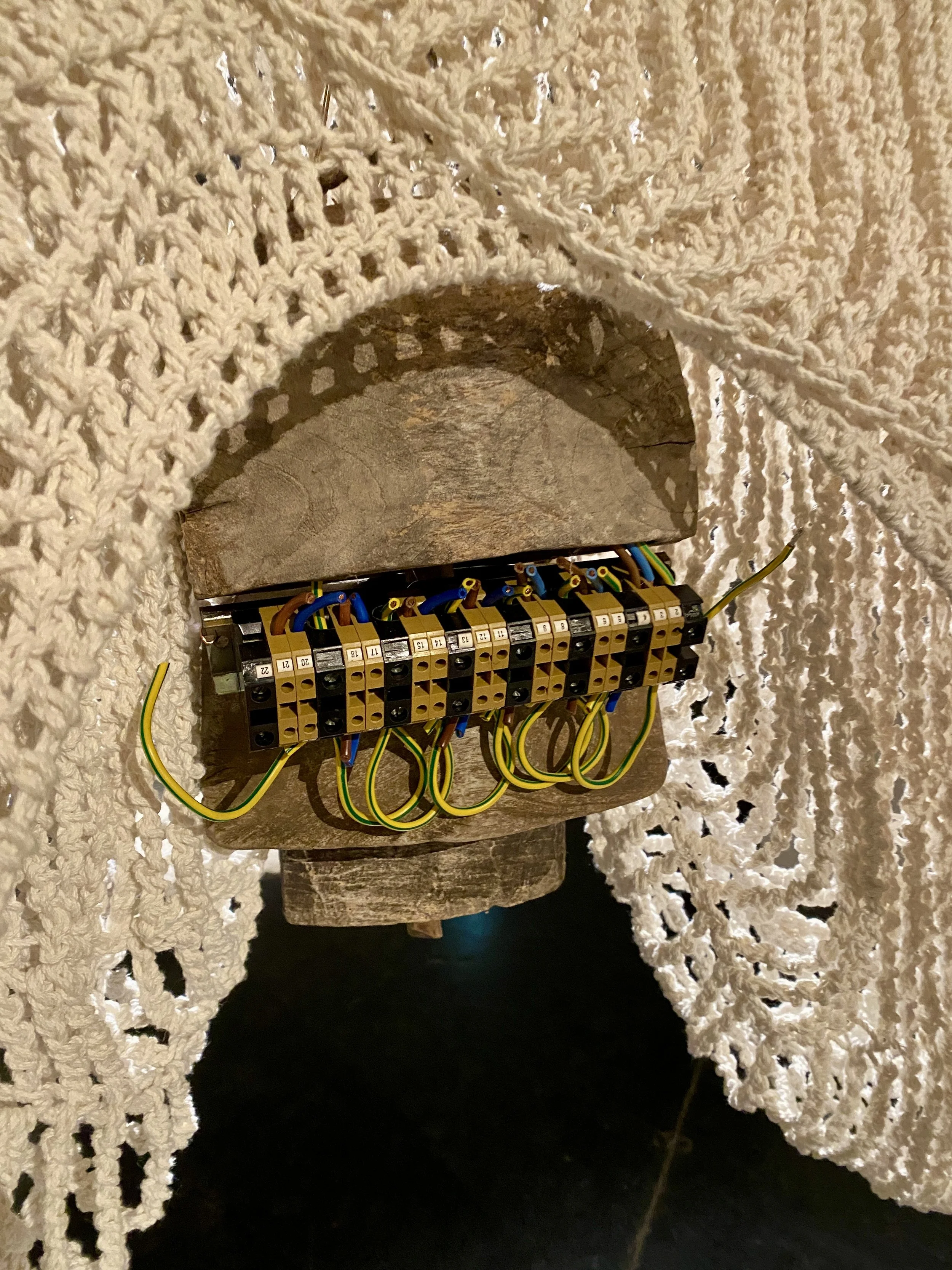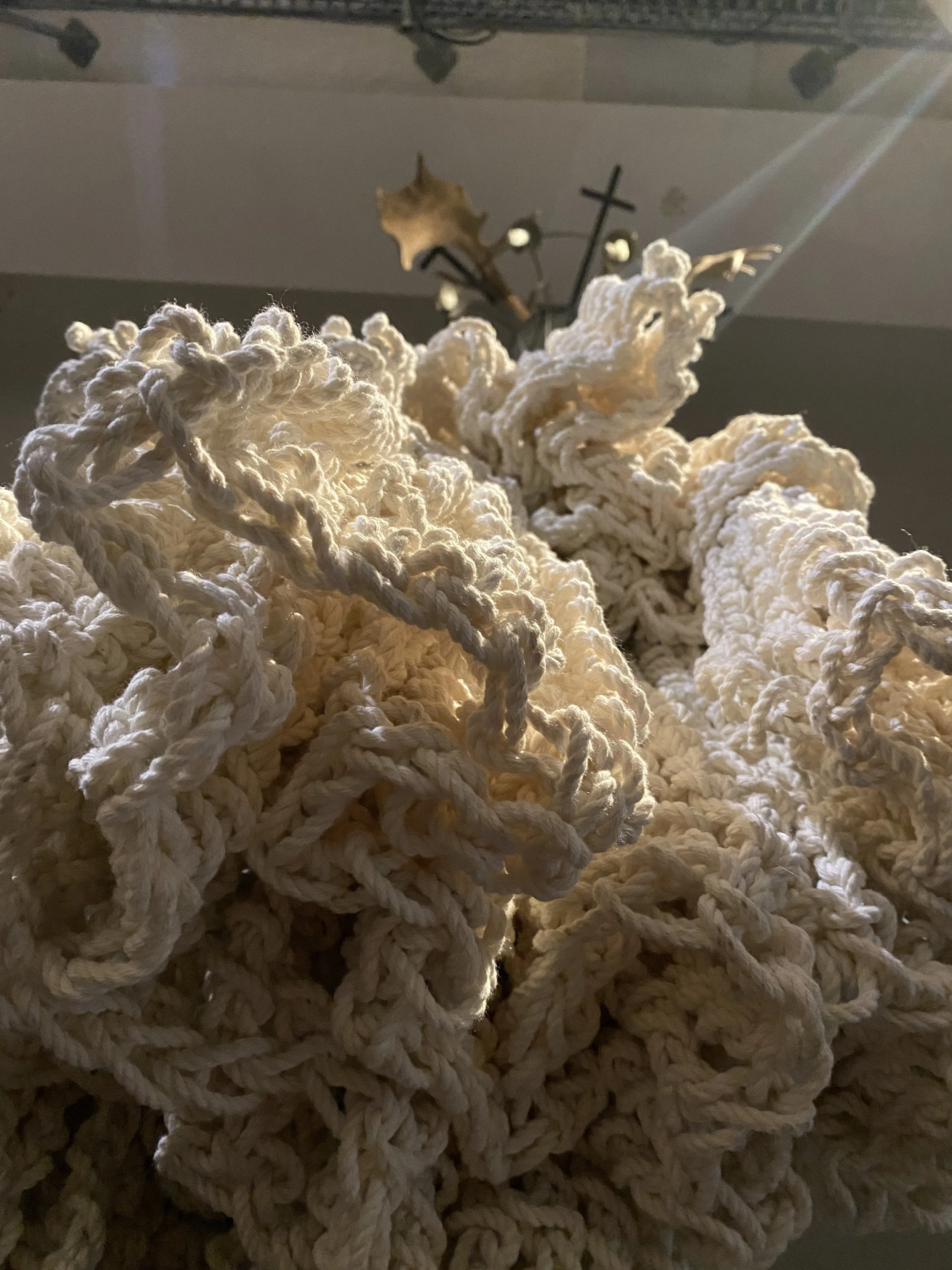 Hand-crocheted organic unbleached cotton cord, birch wood hoop, metal stand welded by Vlad Korman using scrap metal from KOVAC STAHL GmbH, muslin from my wedding, salvaged Balinese wooden bells, apparatus from the Large Hadron Collider at CERN, wooden splinter from an old tree which lost a massive limb during the flood in September 2024. Dimensions Variable