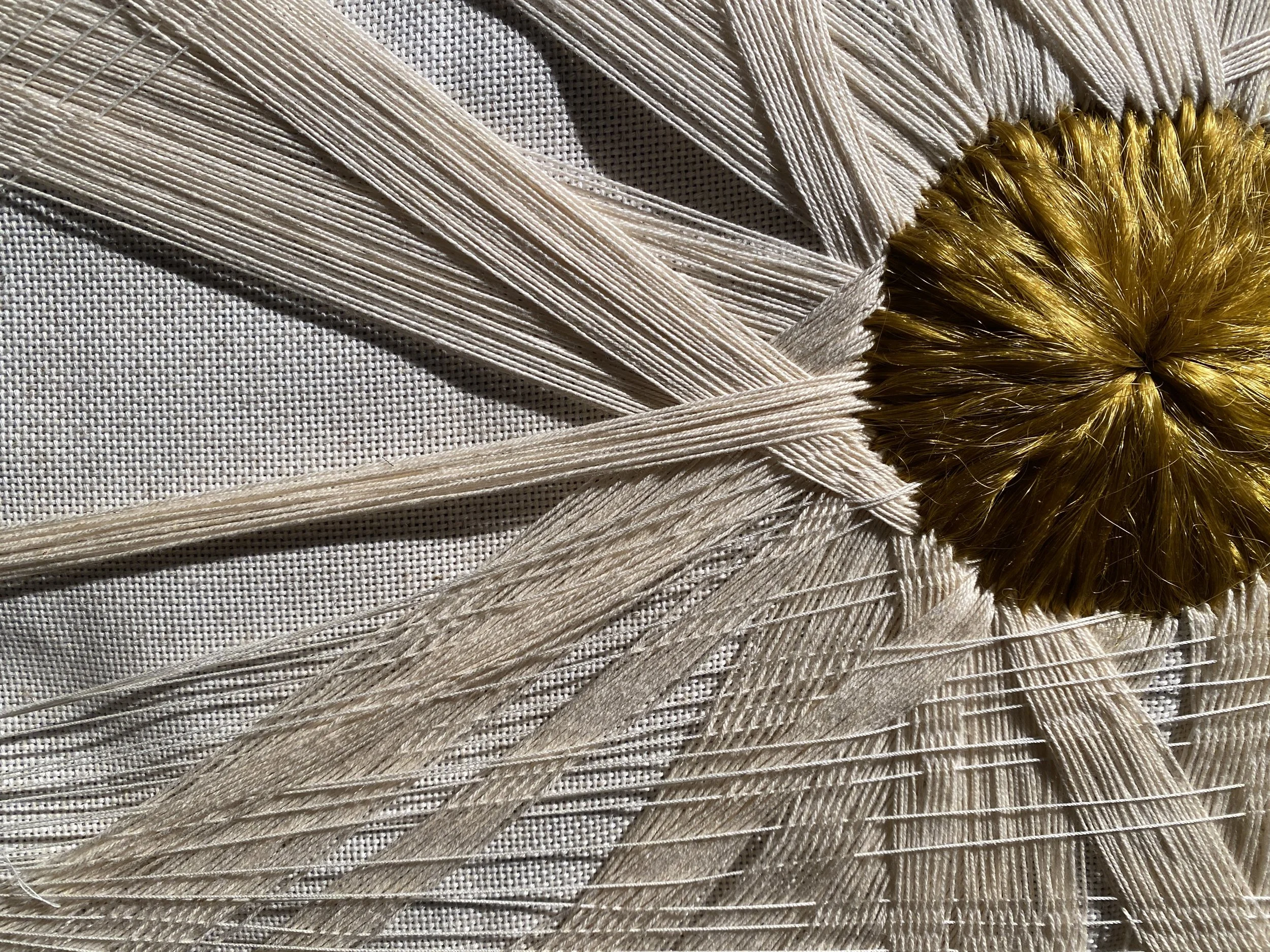 Hand-Embroidered synthetic hair, waxed linen, cotton aida fabric. 120 x 30 cm