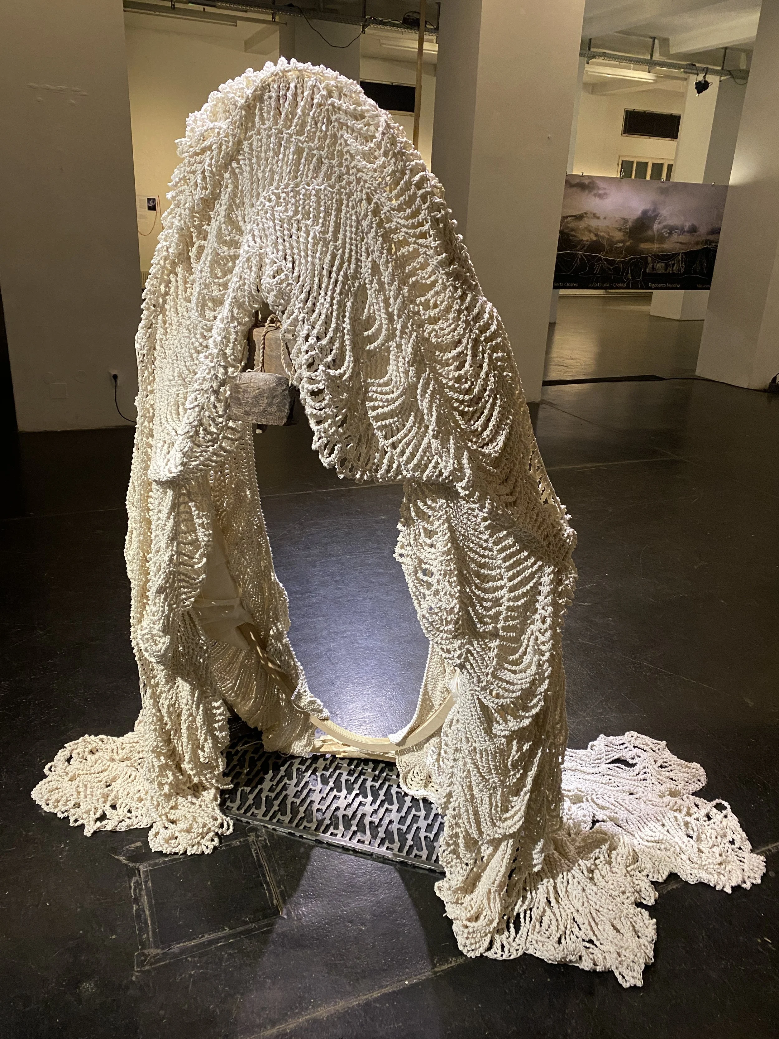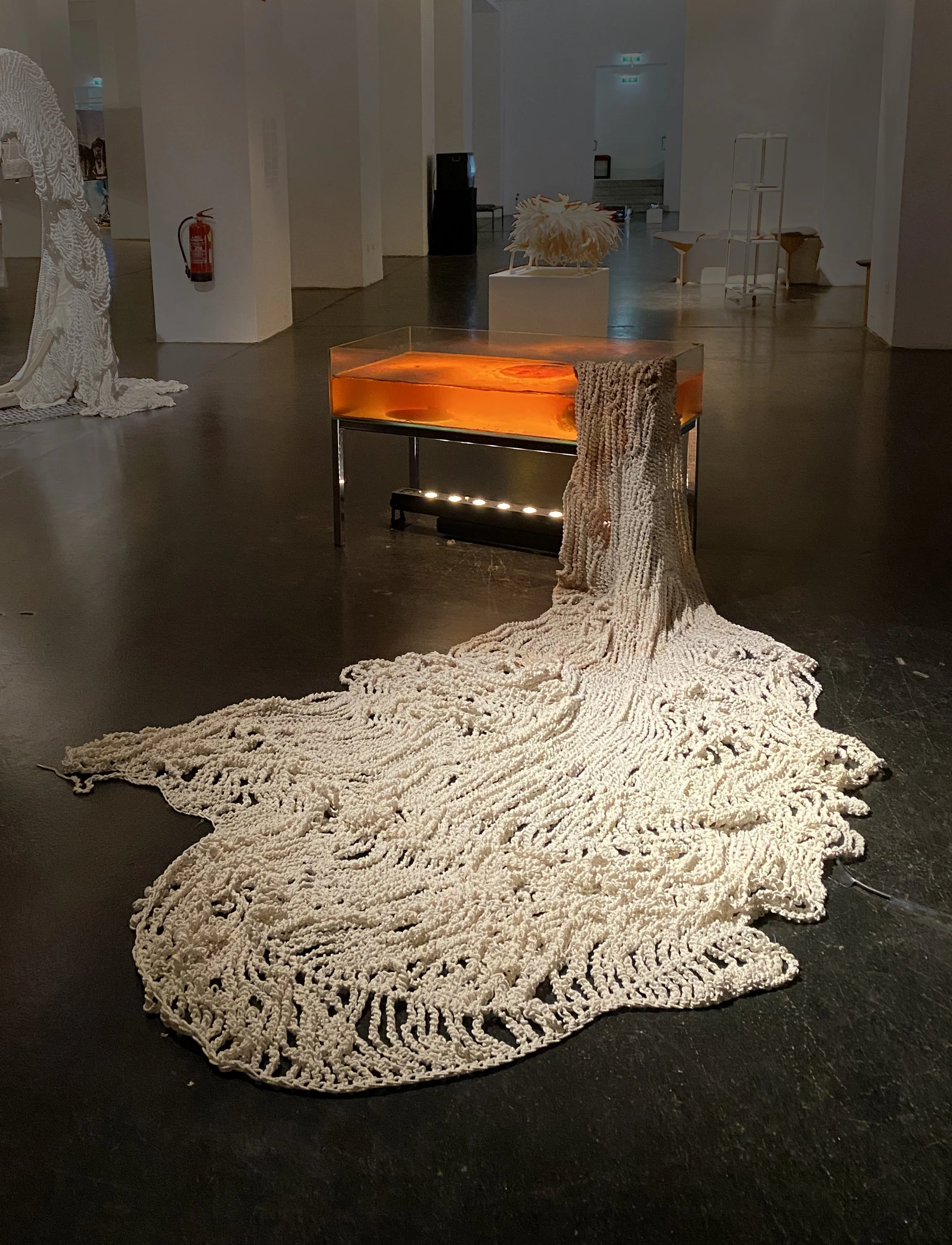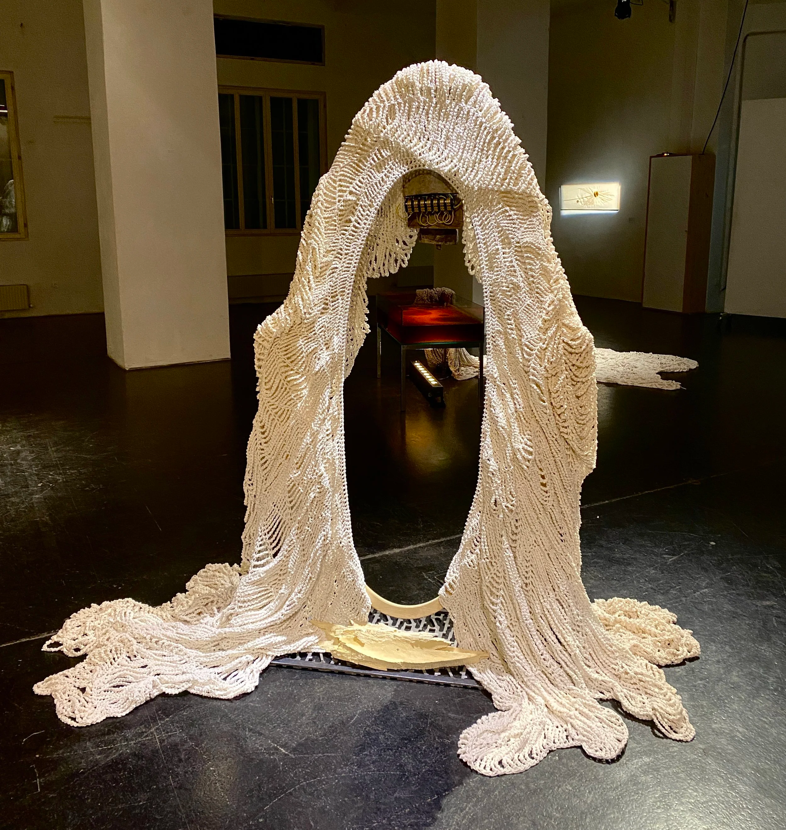 The works are assembled from hand-crocheted textiles reflecting on humans’ capacity to transmit and inherit memories of our symbiotic origins through DNA,d salvaged objects which, through their origin or use stories, serve as keys to and amplifiers of the type of transformation each portal offers,