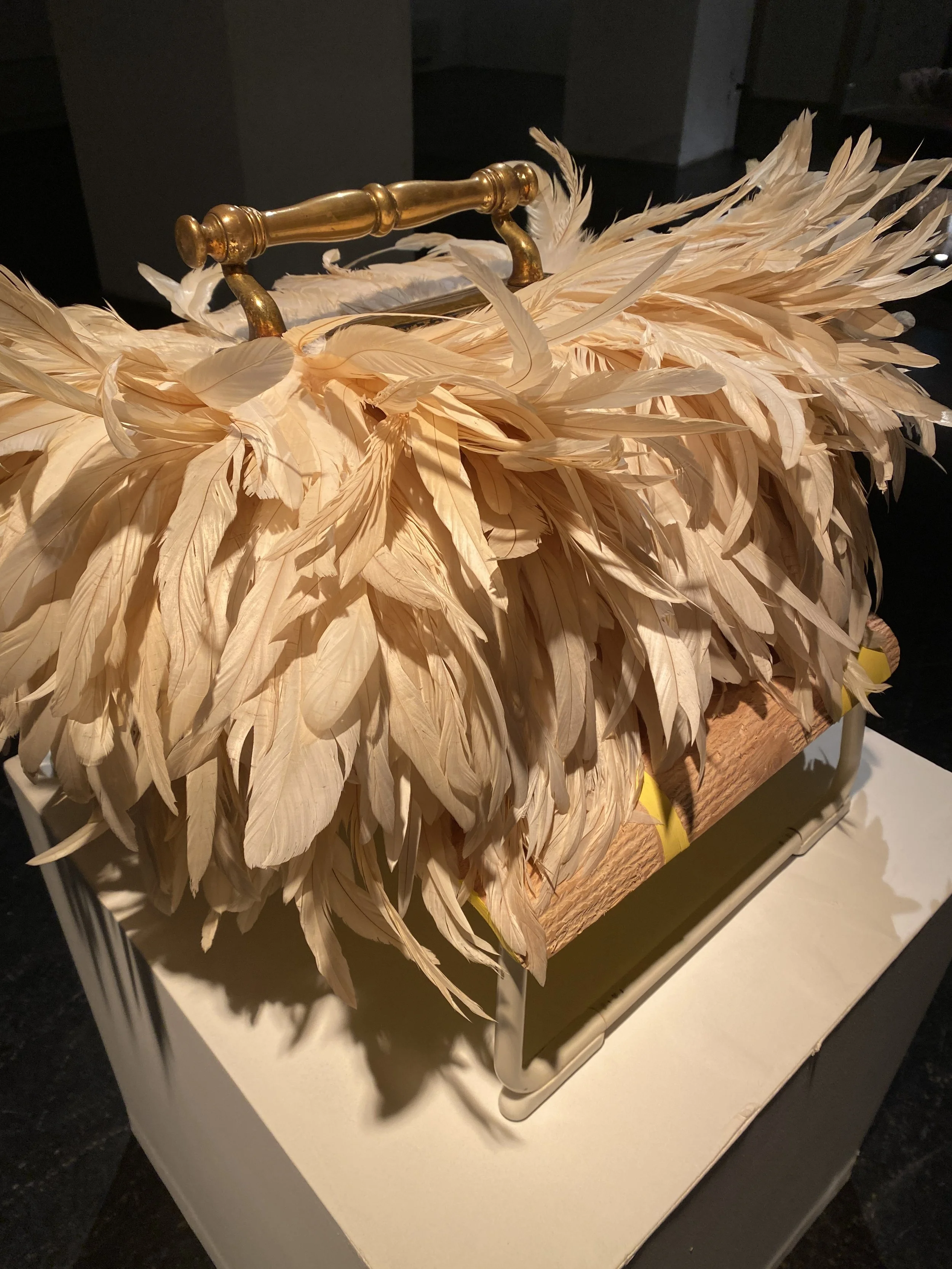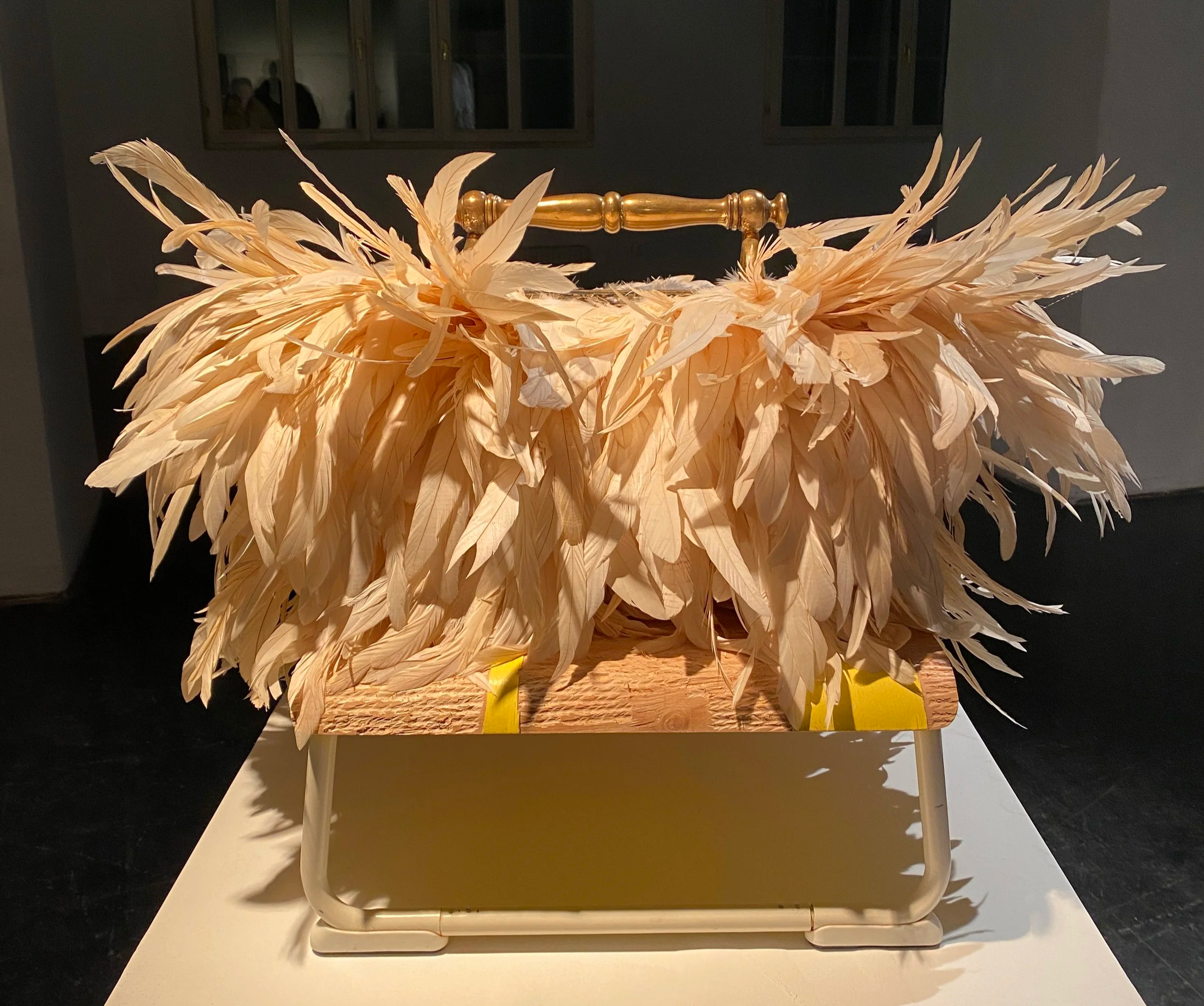 Hand-carved step stool from bathing my kid, abandoned rooster feathers, gifted brass door handle from my husband. 60 x 45 x 80 cm