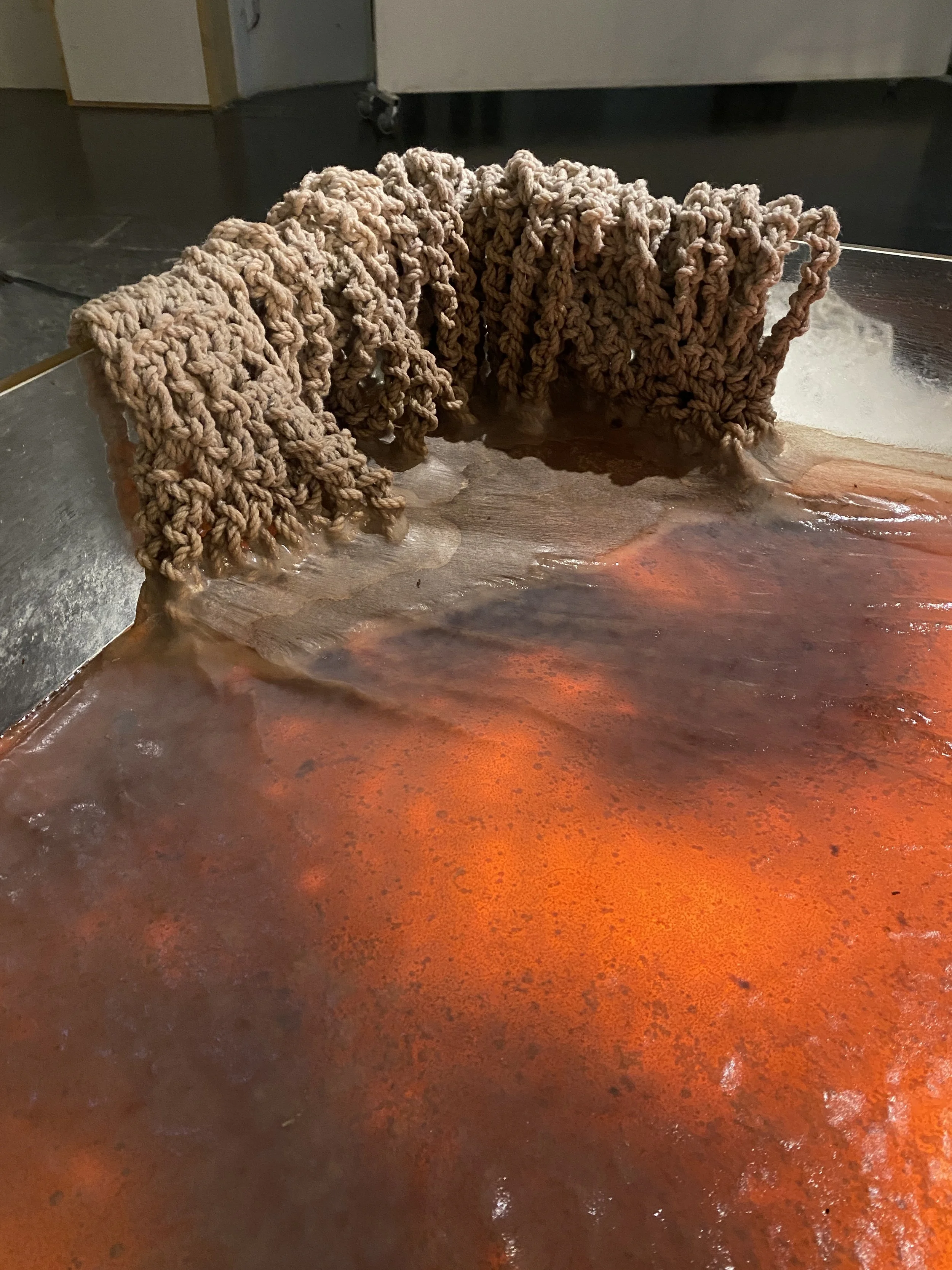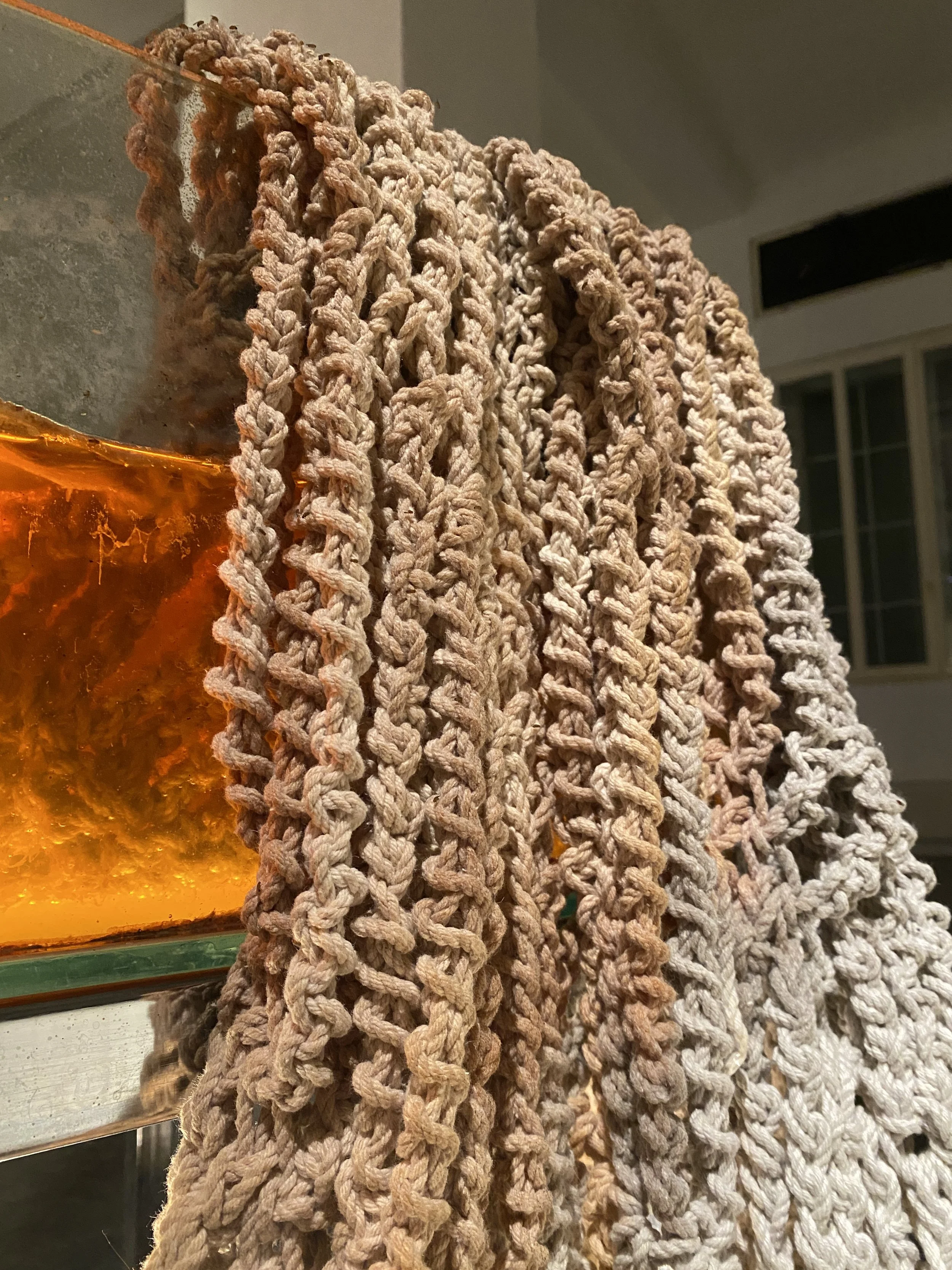 Hand-crocheted organic unbleached cotton cord, salvaged glass vitrine and metal stand, mirror, bacterial cellulose, fermenting tea, beet juice, flies. Dimensions Variable