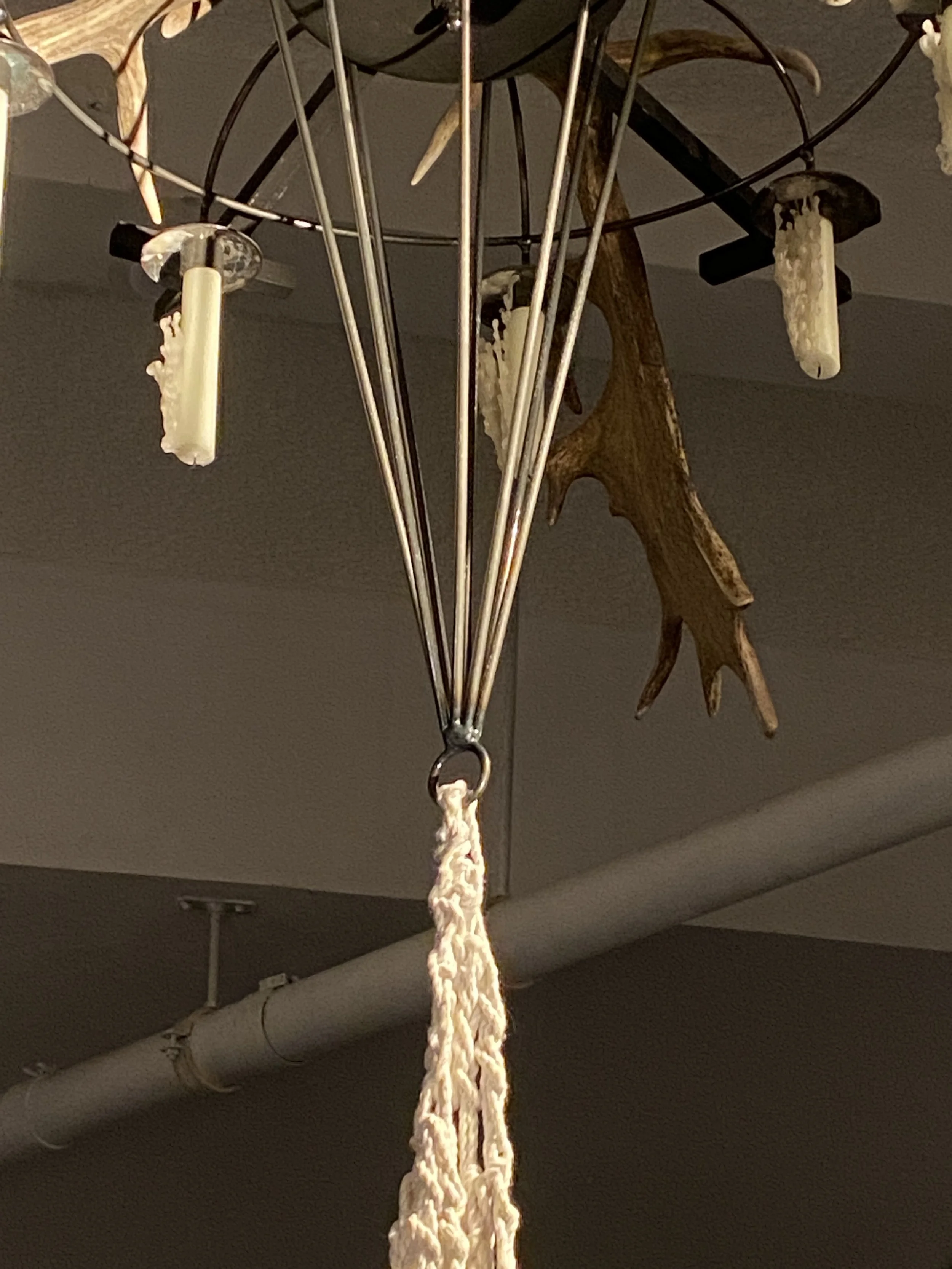 Hand-crocheted organic unbleached cotton cord, candelabra from the house where we were married, friend's salvaged wooden hanging device from Semmelweis, antlers from Rudi Sr.'s farm, mom's Moroccan candle stand, brother's fossil. Dimensions Variable